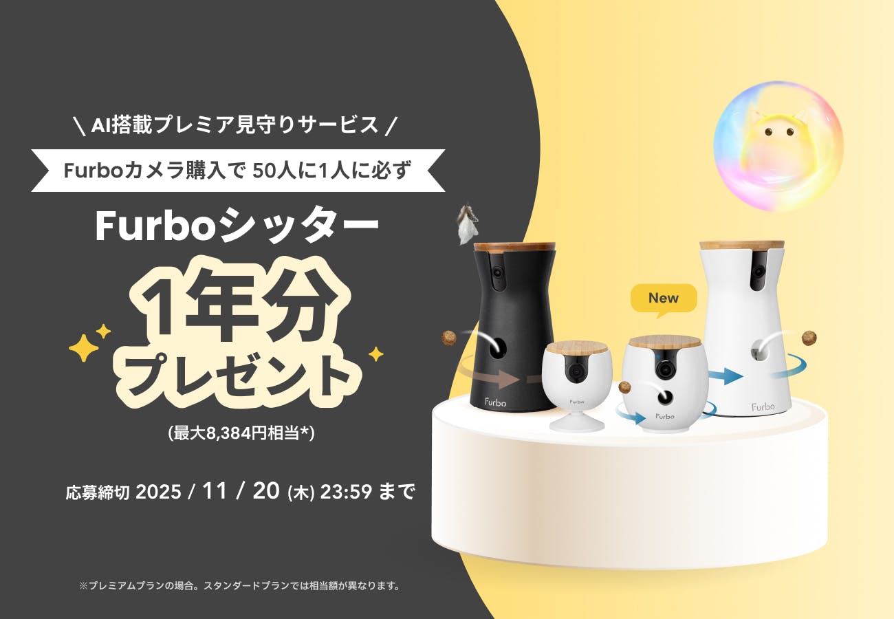 - 参加方法:キャンペーン期間中にFurbo公式オンラインストアでペットカメラを購入(Furboミニ 360°ビュー、Furboミニ、ドッグカメラ360°ビュー、ネコカメラ360°ビューのいずれか)。※単体製品または定額セットプランどちらでも可