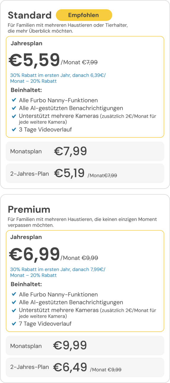Seit dem Start von Furbo Nanny im Jahr 2019 haben wir unsere AI-Technologie kontinuierlich weiterentwickelt, um die Tierbetreuung smarter und sicherer zu machen. Da unsere Funktionen erweitert und weiterentwickelt werden, helfen uns diese Plan-Updates dabei, weiterhin sinnvolle Innovationen zu liefern und die Zukunft der Tierbetreuung voranzutreiben. Diese Updates sollen Ihnen mehr Flexibilität bieten – sei es eine Kamera, mehrere Kameras, ein erweiterter Videoverlauf oder das die klassische Furbo Nanny Erfahrung, die Sie kennen und lieben.*
