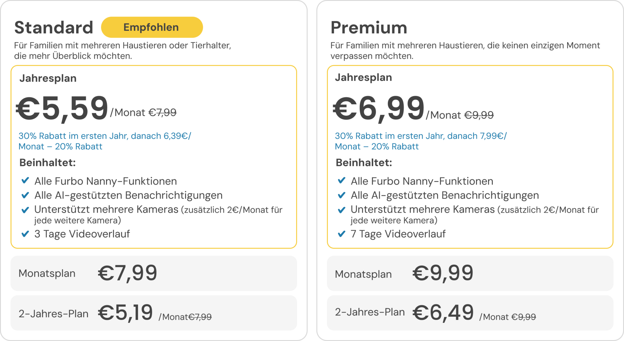 Seit dem Start von Furbo Nanny im Jahr 2019 haben wir unsere AI-Technologie kontinuierlich weiterentwickelt, um die Tierbetreuung smarter und sicherer zu machen. Da unsere Funktionen erweitert und weiterentwickelt werden, helfen uns diese Plan-Updates dabei, weiterhin sinnvolle Innovationen zu liefern und die Zukunft der Tierbetreuung voranzutreiben. Diese Updates sollen Ihnen mehr Flexibilität bieten – sei es eine Kamera, mehrere Kameras, ein erweiterter Videoverlauf oder das die klassische Furbo Nanny Erfahrung, die Sie kennen und lieben.*