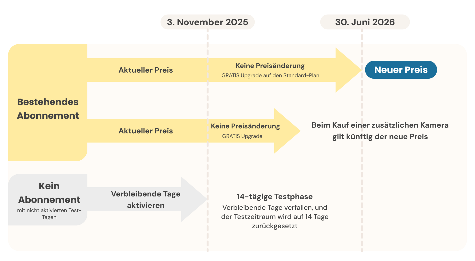 Nichts! Sie werden Ihren aktuellen Plan und Ihre Preise bis zum 30. Juni 2026 weiterhin genießen. Während dieses Zeitraums haben Sie auch die Möglichkeit, den erweiterten Videoverlauf ohne zusätzliche Kosten zu testen.