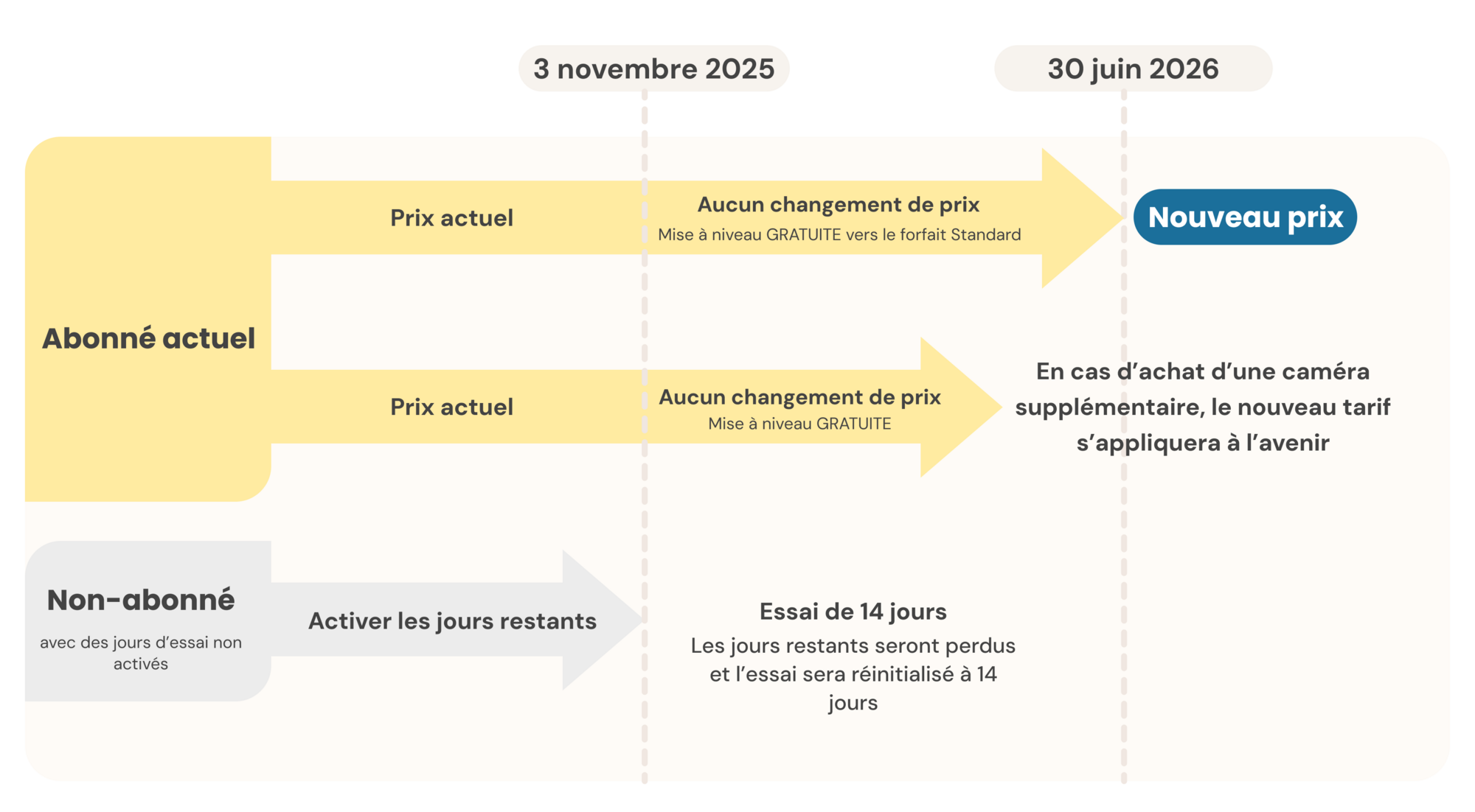 Vous n'avez rien à faire! Vous continuerez à profiter de votre forfait et de vos tarifs actuels jusqu'au 30 juin 2026. Pendant cette période, vous aurez également la possibilité d'explorer l'historique vidéo étendu sans frais supplémentaires.