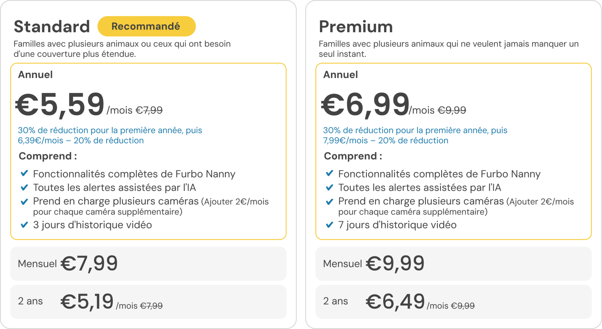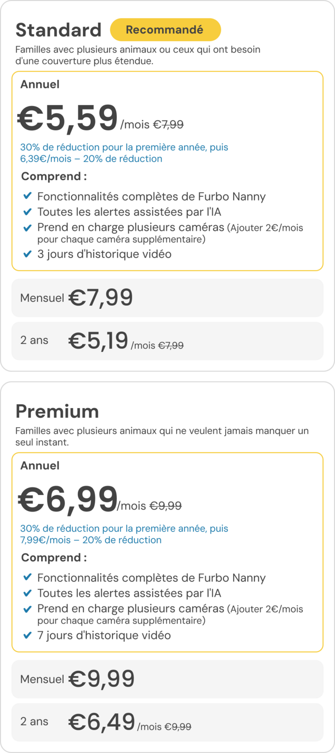 Depuis le lancement de Furbo Nanny en 2019, nous avons constamment fait évoluer notre technologie d’IA pour rendre le suivi des animaux plus intelligent et plus sûr. À mesure que nos fonctionnalités se développent, ces mises à jour de forfaits nous permettront de continuer à proposer des innovations significatives et à faire progresser l’avenir des soins à distance pour les animaux. Ces changements ont été conçus pour vous offrir plus de flexibilité, que vous ayez une ou plusieurs caméras, que vous souhaitiez un historique vidéo étendu, ou que vous préfériez garder l’expérience classique de Furbo Nanny.