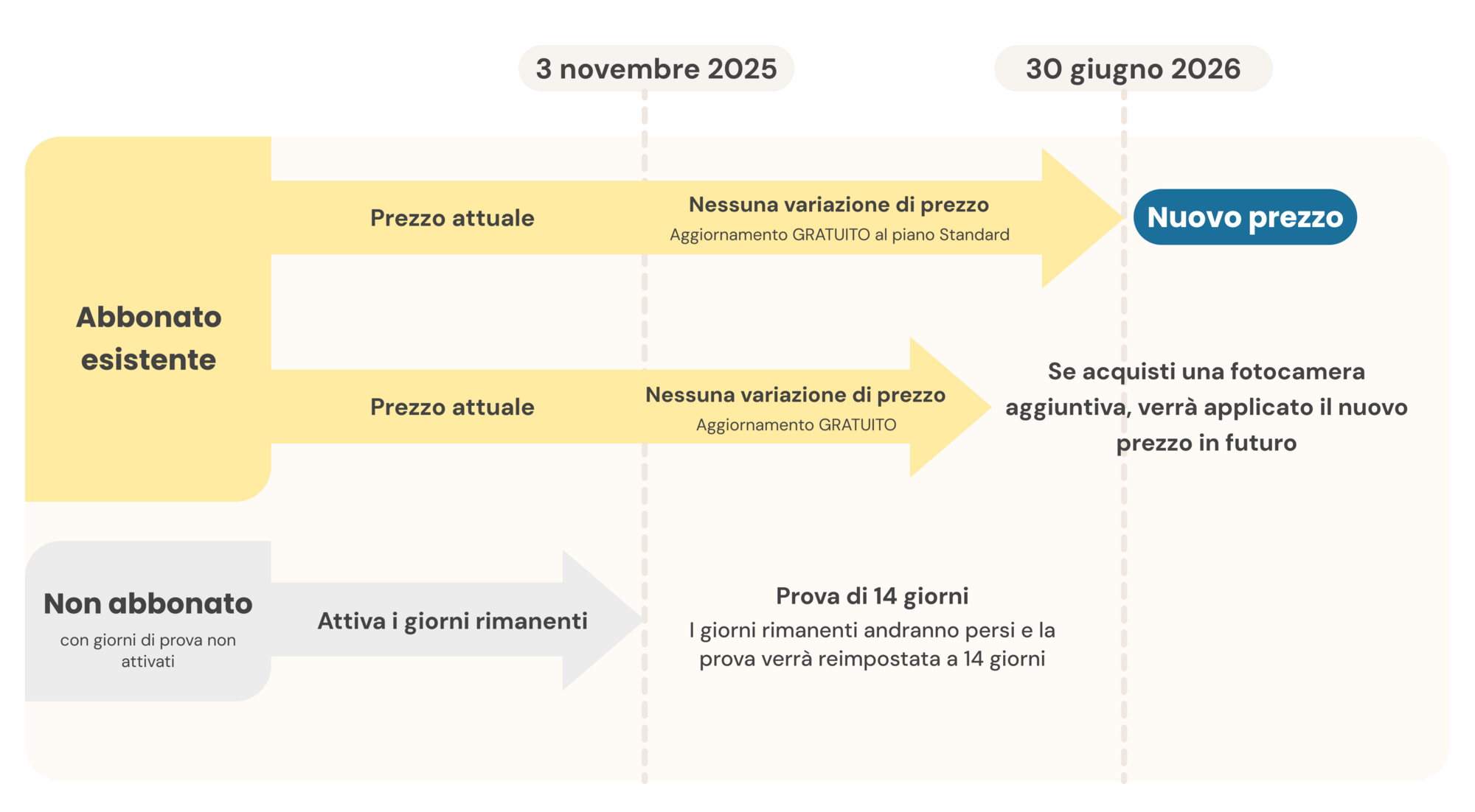 Niente! Continuerai a usufruire del tuo piano e dei tuoi prezzi attuali fino al 30 giugno 2026. Durante questo periodo, avrai anche la possibilità di esplorare la cronologia video estesa senza costi aggiuntivi.