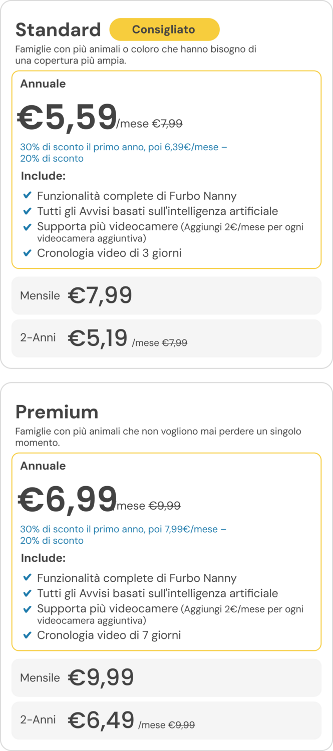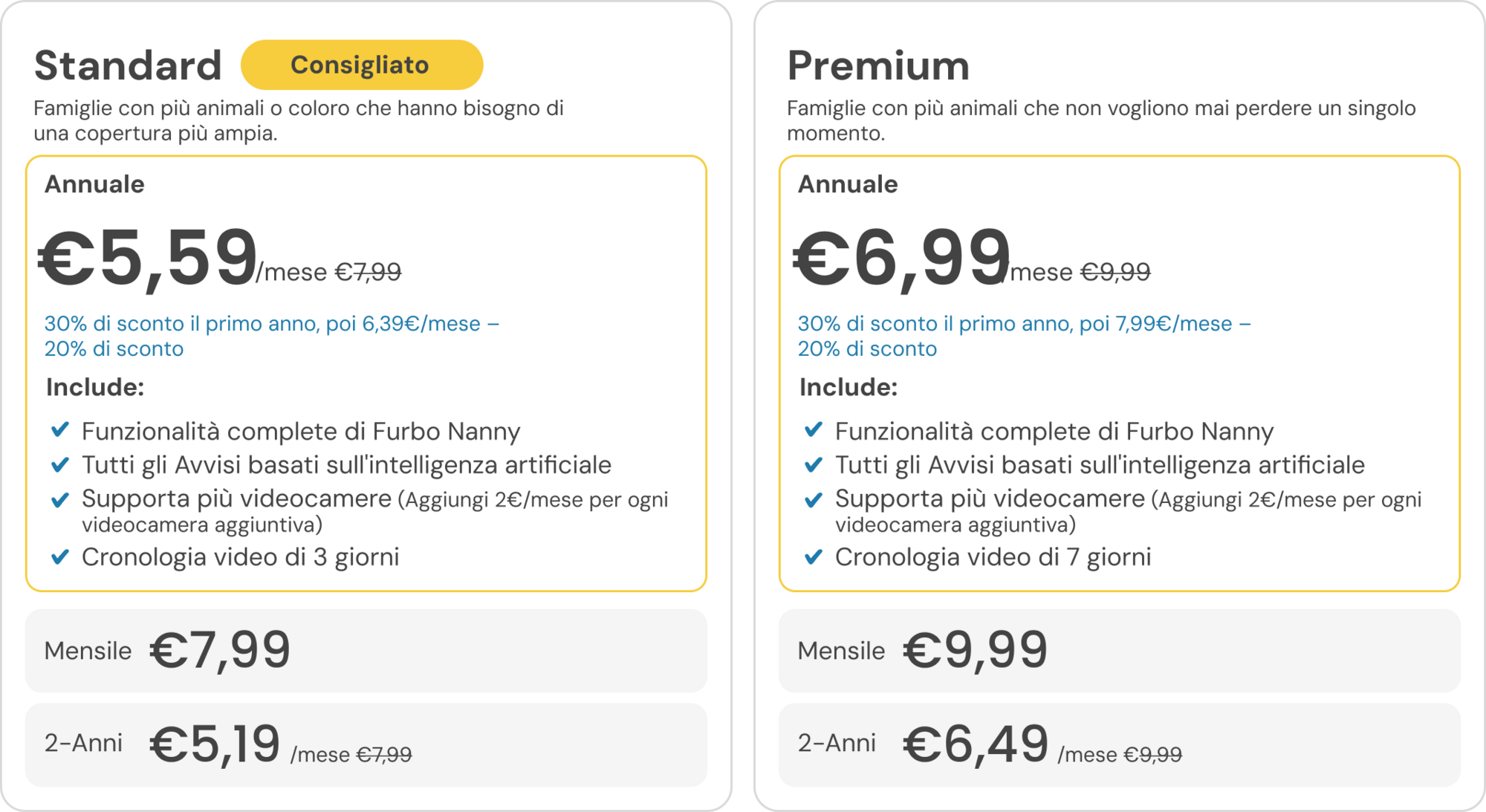 Da quando abbiamo lanciato Furbo Nanny nel 2019, abbiamo continuamente avanzato la nostra tecnologia AI per rendere la cura degli animali domestici più intelligente e sicura. Man mano che le nostre funzionalità si espandono ed evolvono, questi aggiornamenti dei piani ci aiuteranno a continuare a fornire innovazione significativa e a far progredire ulteriormente il futuro della cura degli animali domestici. Questi aggiornamenti sono progettati per darti maggiore flessibilità, che si tratti di una singola telecamera, di più telecamere, di una cronologia video estesa o di rimanere con la classica esperienza Furbo Nanny che conosci e ami.*
