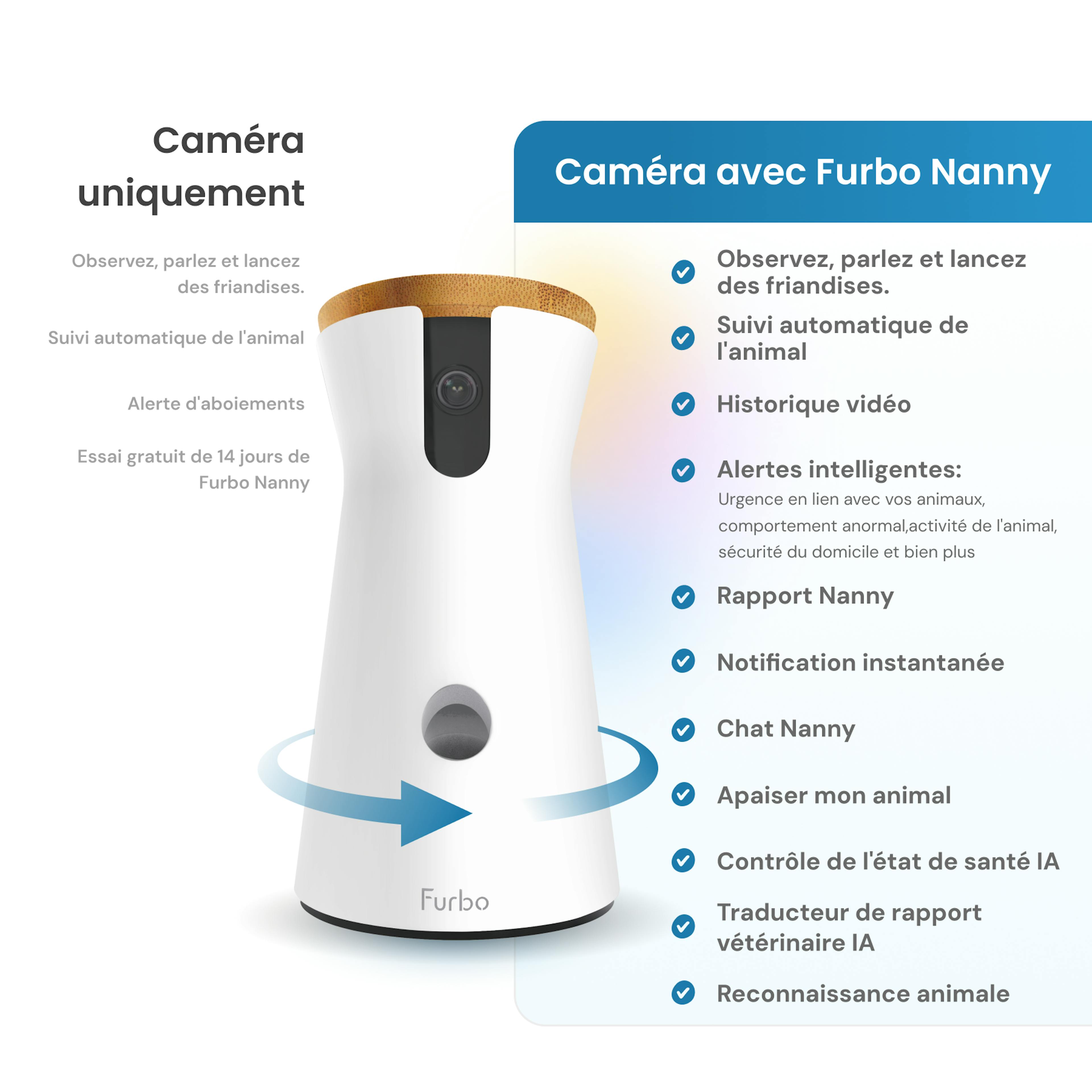 L'IA de Furbo Nanny devient toujours plus intelligente au fur et à mesure qu'elle apprend à mieux connaître les habitudes et les comportements de votre chien. Restez à l'écoute pour découvrir les nouvelles fonctionnalités et les mises à jour.