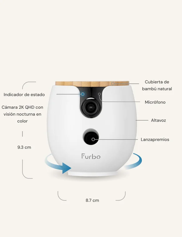 La cámara con IA para mascotas más inteligente, ahora en versión mini: con vista 360° en 2K QHD y lanzapremios, diseñada para para adaptarse a cualquier rincón.